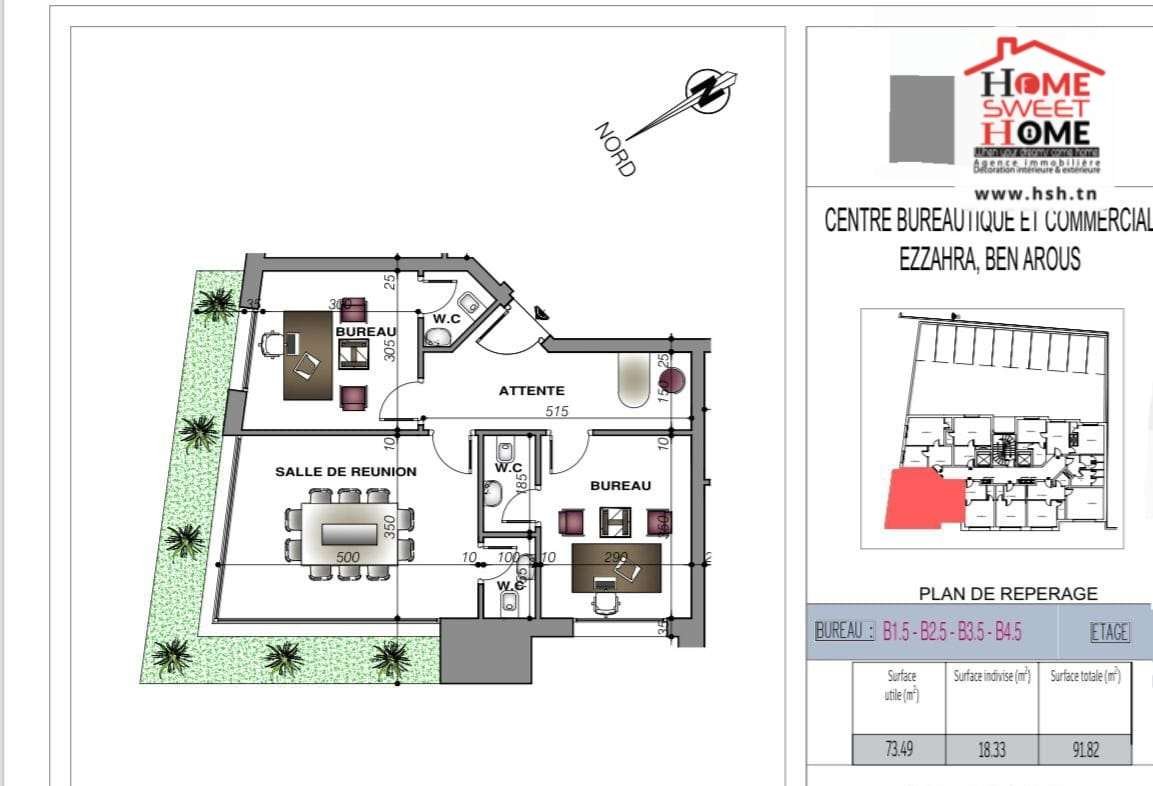 Bureau H3 d’une superficie de 91 m², situé au 4éme étage d’une résidence de haut standing à Ezzahra. Il comprend à l’entrée une salle d’attente, 3 bureaux, une cuisine et de 3 salles d’eau dans chaque bureau. La résidence est équipé d’un ascenseur. Pour plus de renseignements, veuillez contacter l’agent au 51658170.