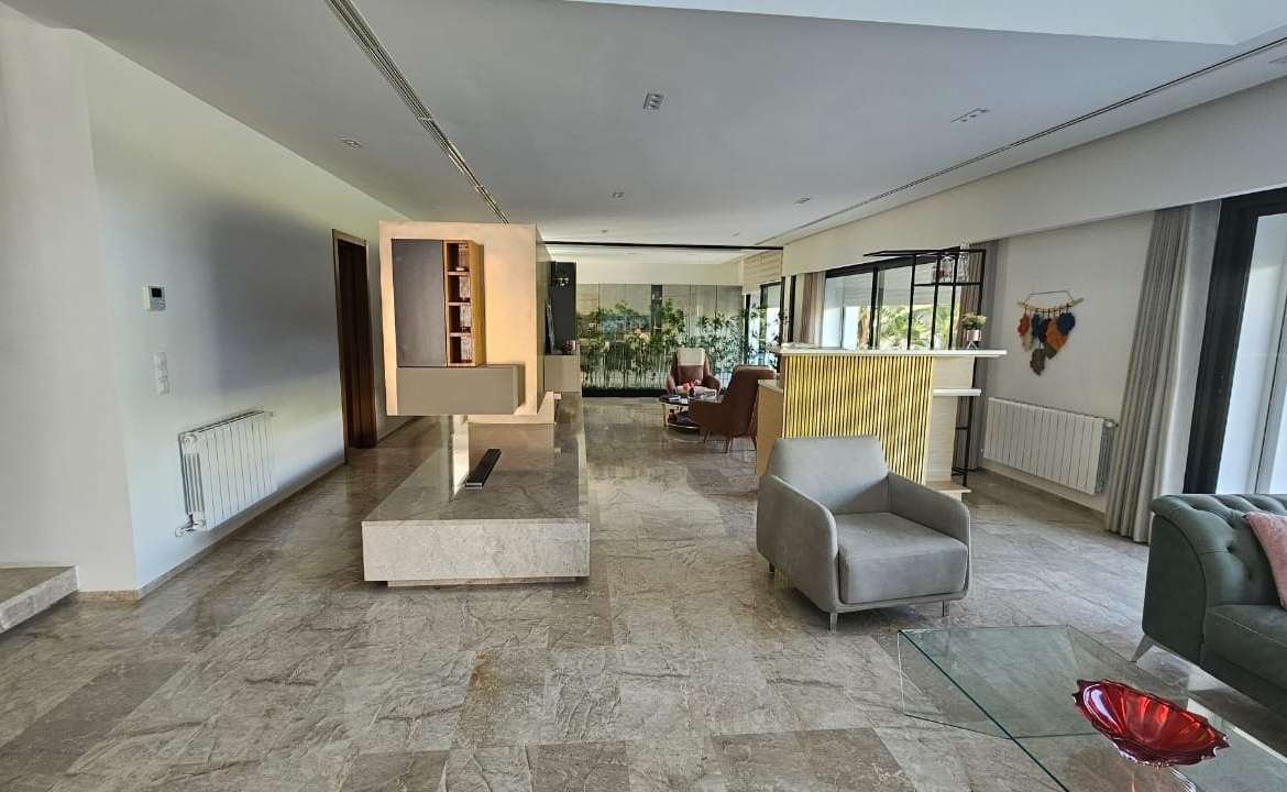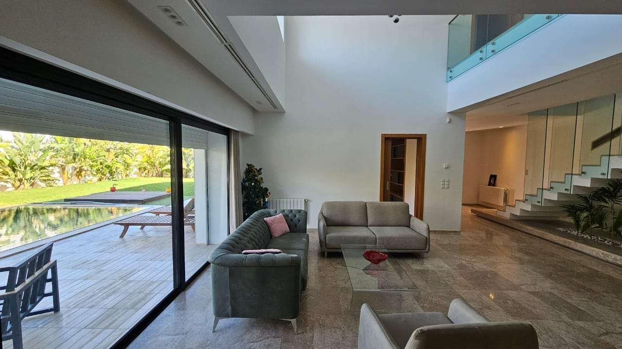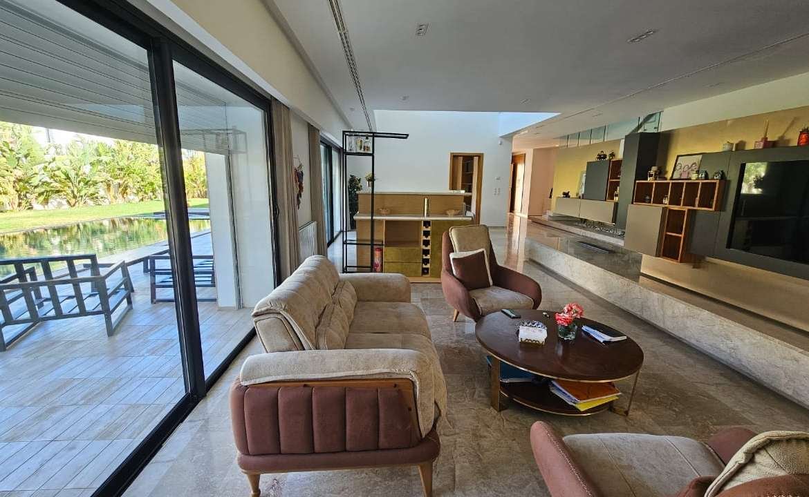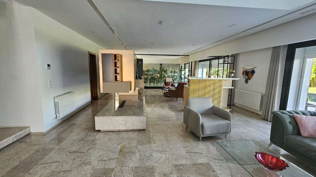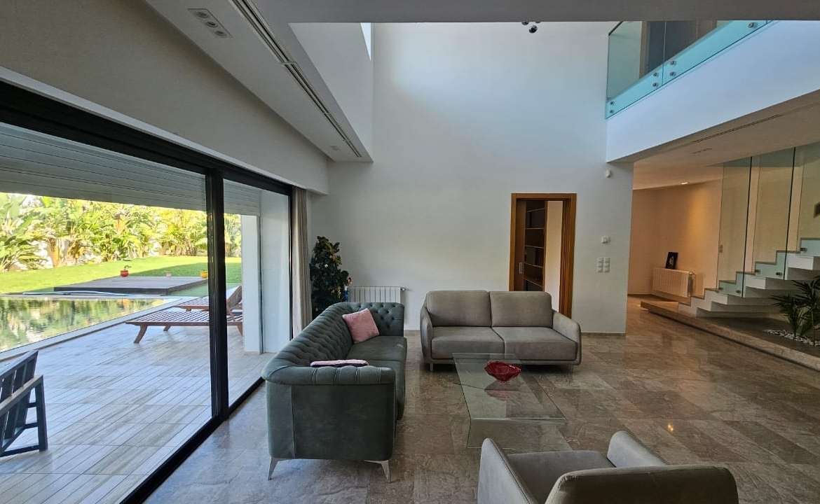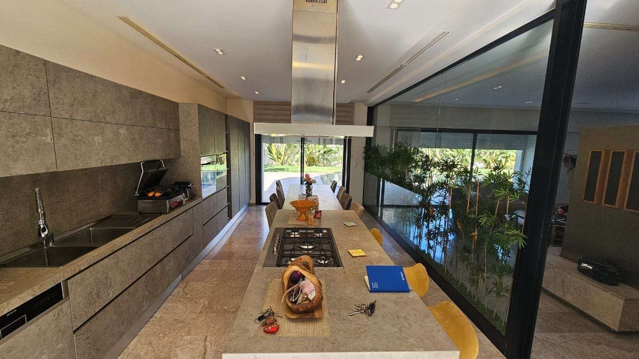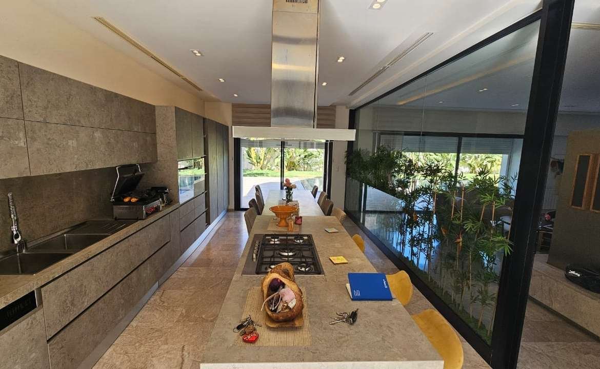 Au rez-de-chaussée, un vaste salon baigné de lumière avec une double hauteur sous plafond, donnant sur la piscine et le jardin, une suite avec dressing, un séjour, une salle d’eau pour les invités, une cuisine moderne et fonctionnelle avec un espace ouvert sur la piscine et le jardin, ainsi qu’une deuxième cuisine.