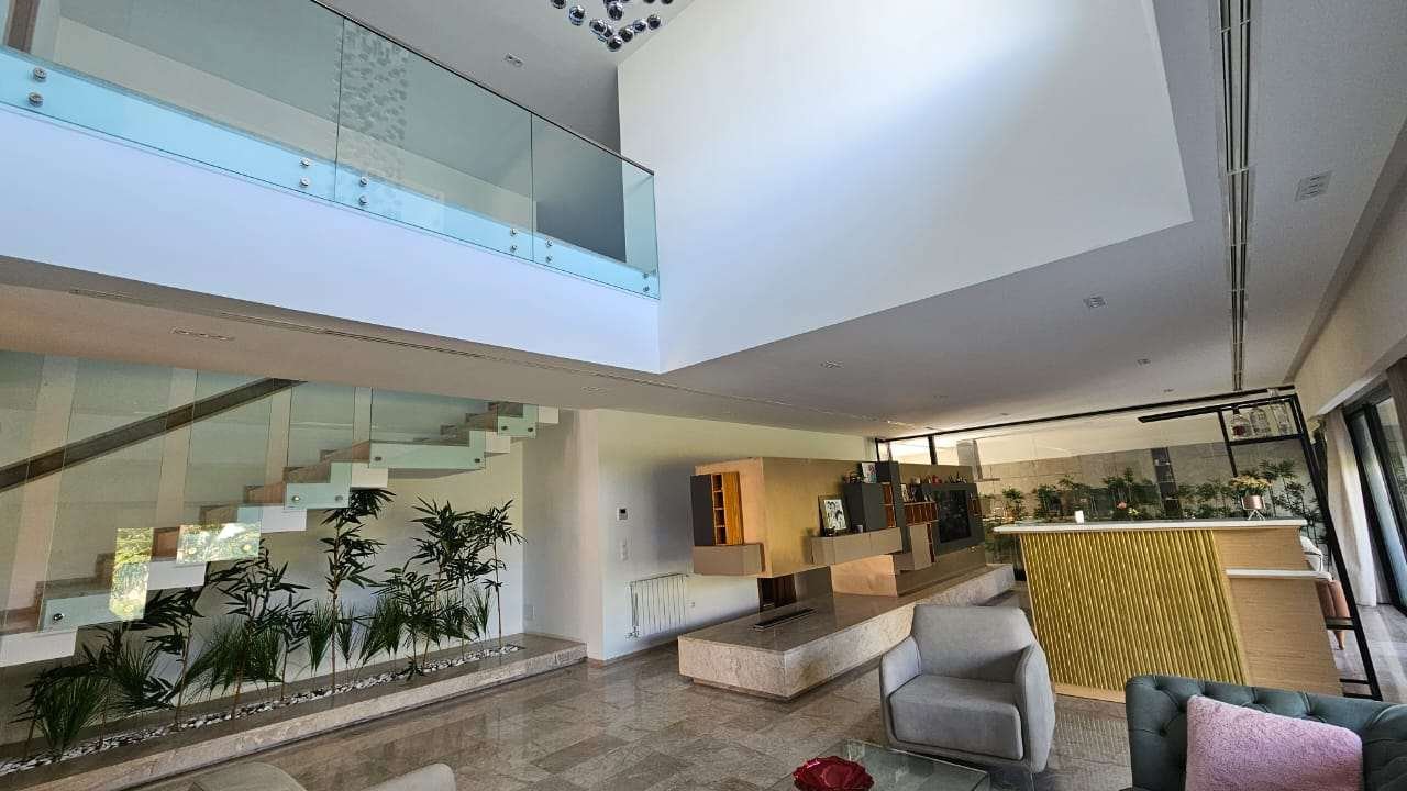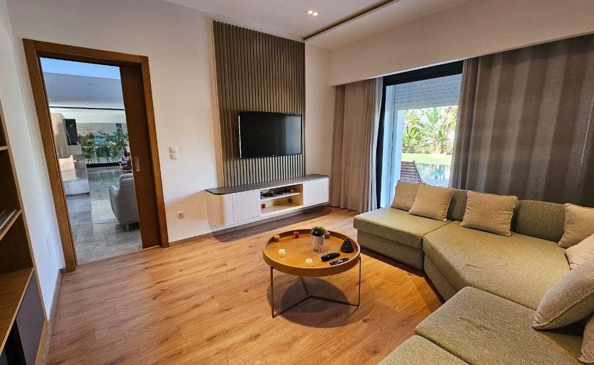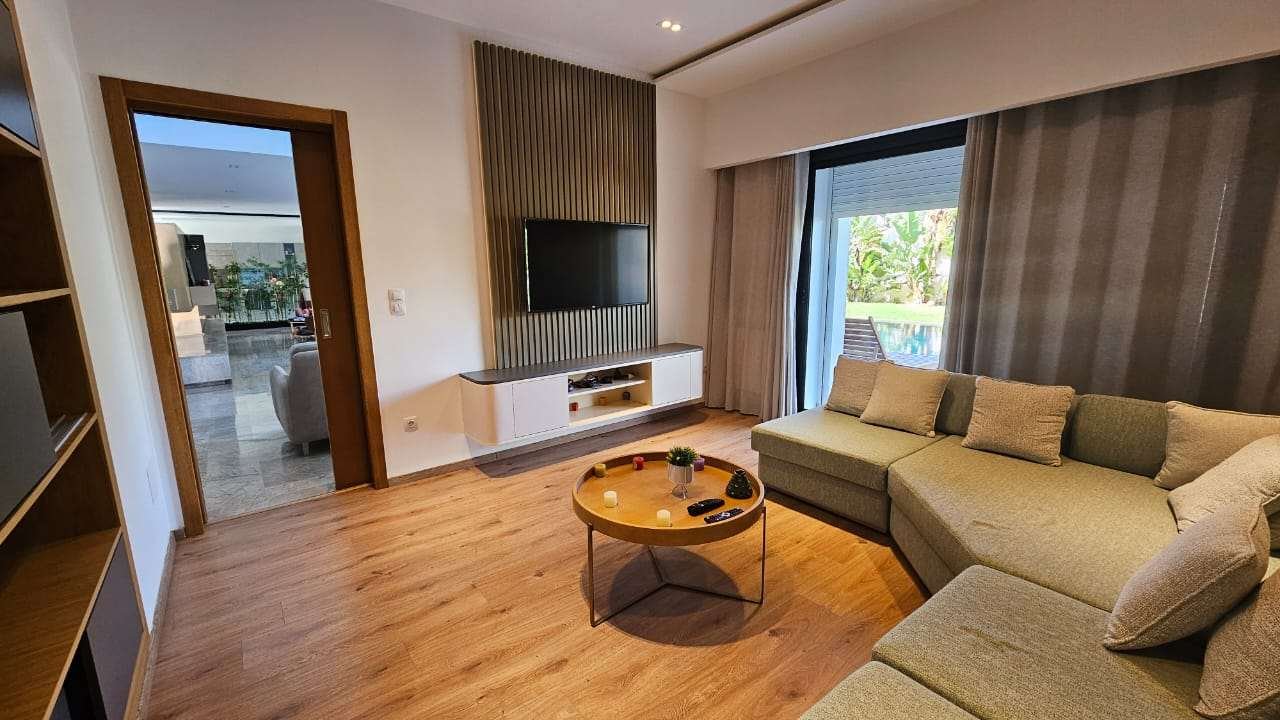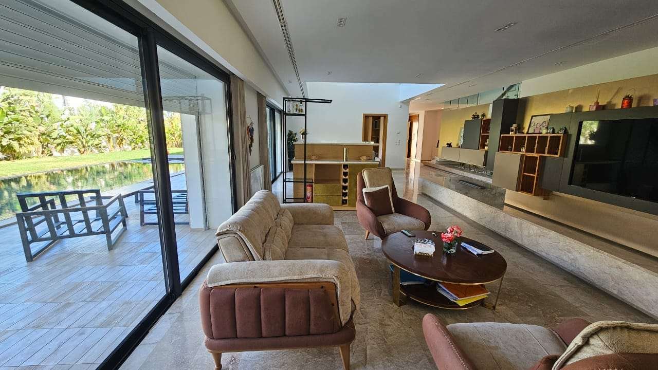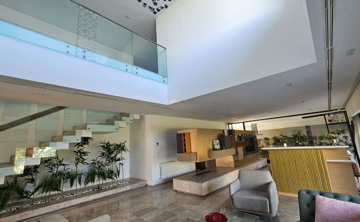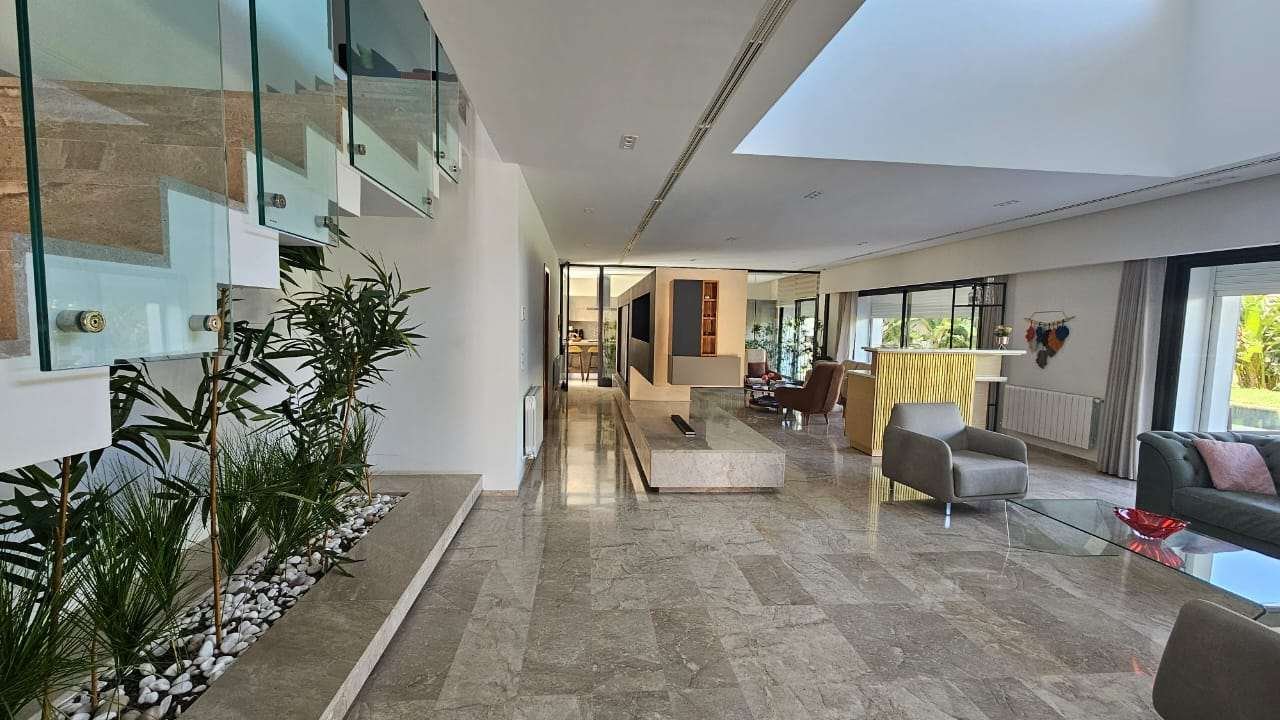 Au rez-de-chaussée, un vaste salon baigné de lumière avec une double hauteur sous plafond, donnant sur la piscine et le jardin, une suite avec dressing, un séjour, une salle d’eau pour les invités, une cuisine moderne et fonctionnelle avec un espace ouvert sur la piscine et le jardin, ainsi qu’une deuxième cuisine.