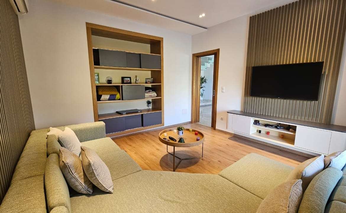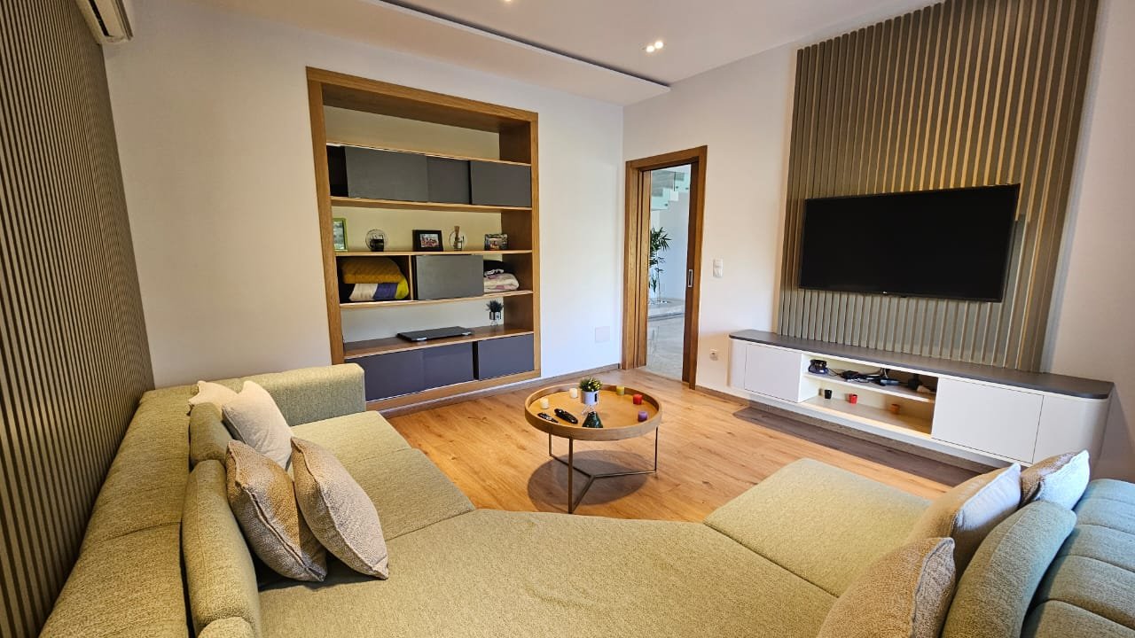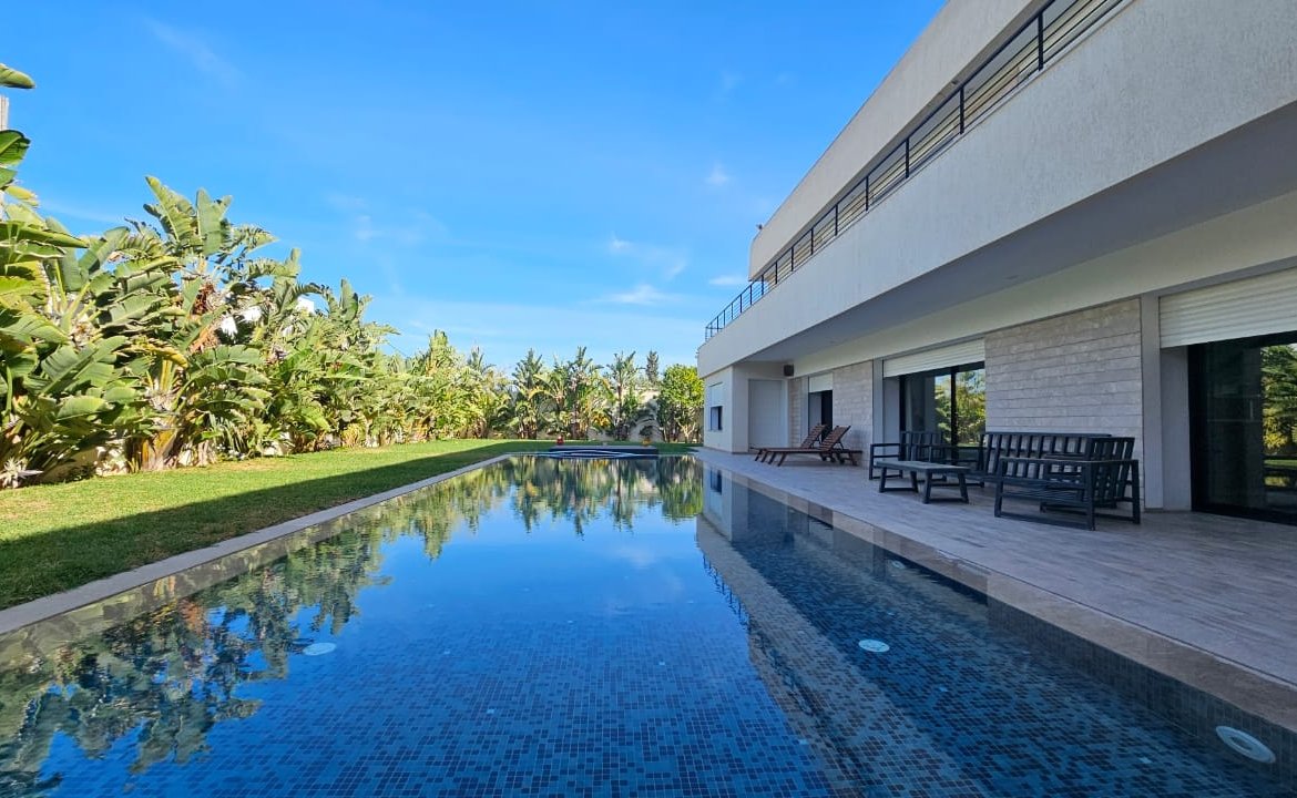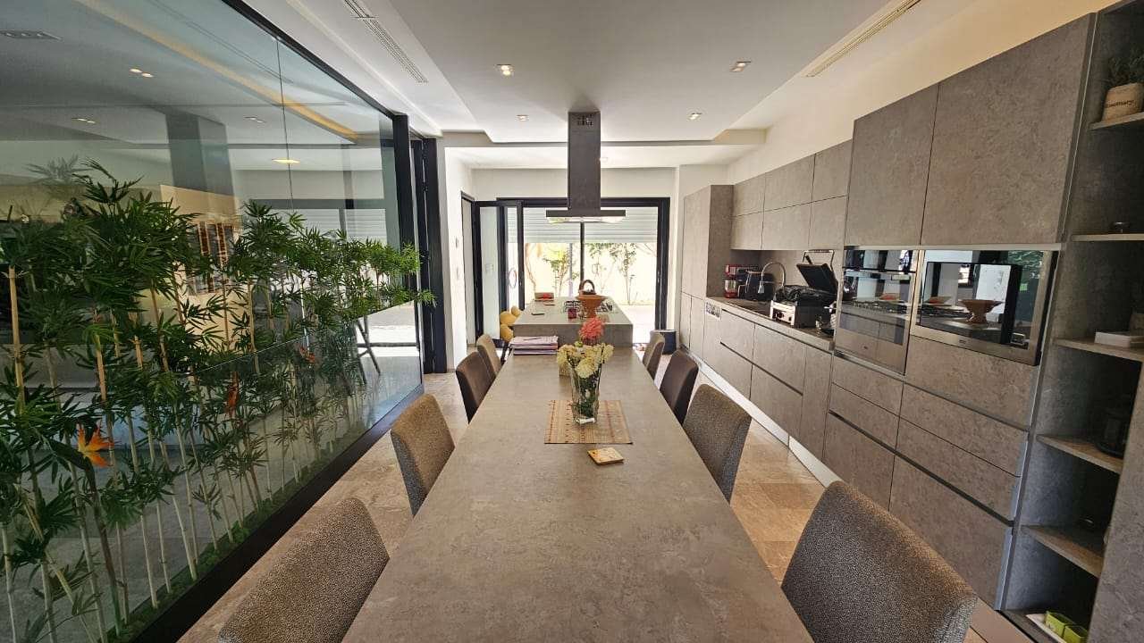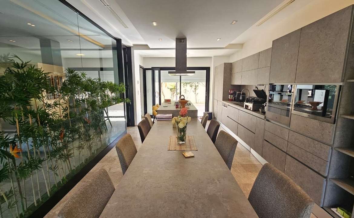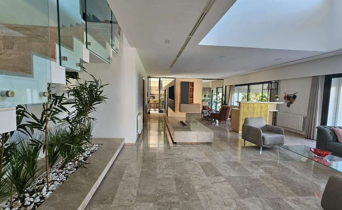 Au rez-de-chaussée, un vaste salon baigné de lumière avec une double hauteur sous plafond, donnant sur la piscine et le jardin, une suite avec dressing, un séjour, une salle d’eau pour les invités, une cuisine moderne et fonctionnelle avec un espace ouvert sur la piscine et le jardin, ainsi qu’une deuxième cuisine.