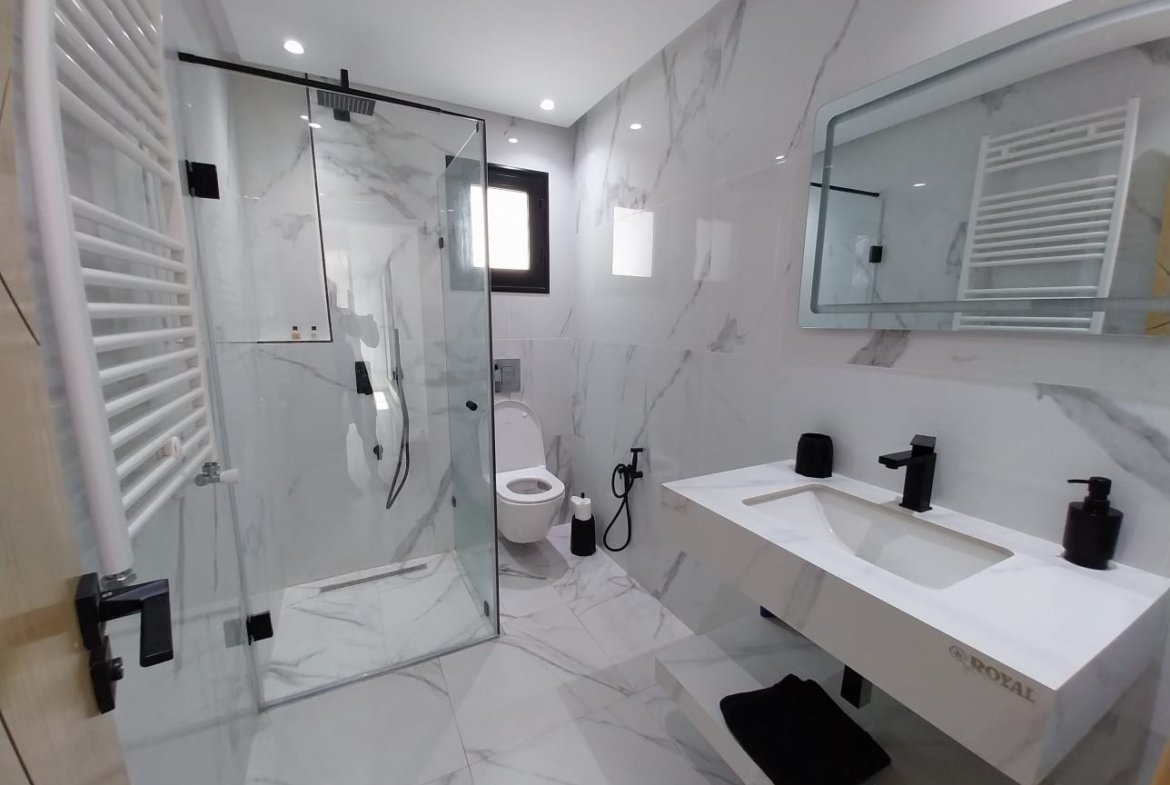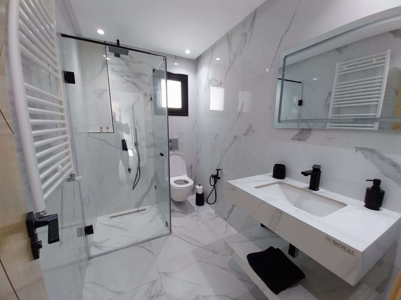 La villa est érigée sur deux niveaux et composée au rez de chaussée d’un spacieux salon, une salle à manger, une chambre pour les invitées, une salle d’eau invité et une cuisine bien équipée qui s’ouvre sur la terrasse de la piscine.
